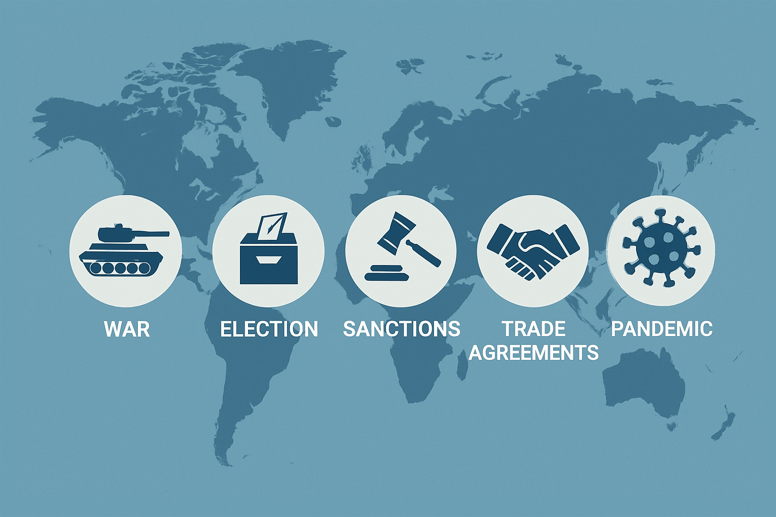 Geopolitical events involve any political, economic, or military activity that affects relationships between countries. Examples include: