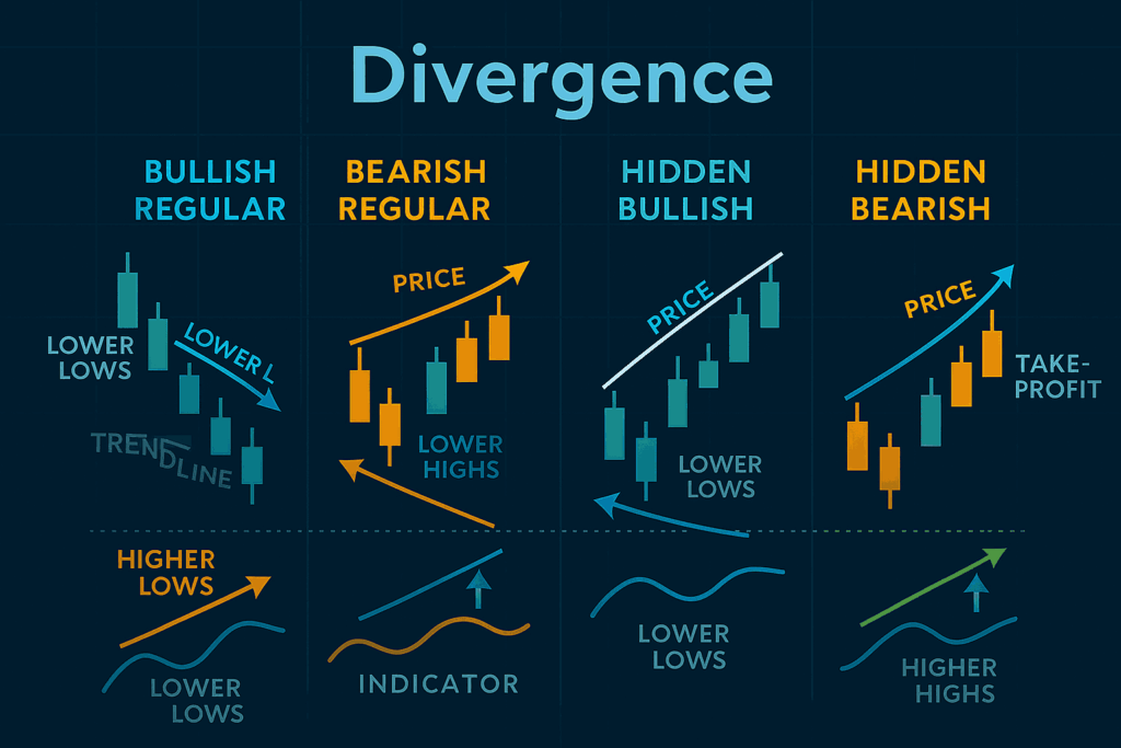 Divergence occurs when the price of a currency pair moves in one direction while an indicator (usually a momentum oscillator like RSI, MACD, or Stochastic) moves in the opposite direction.