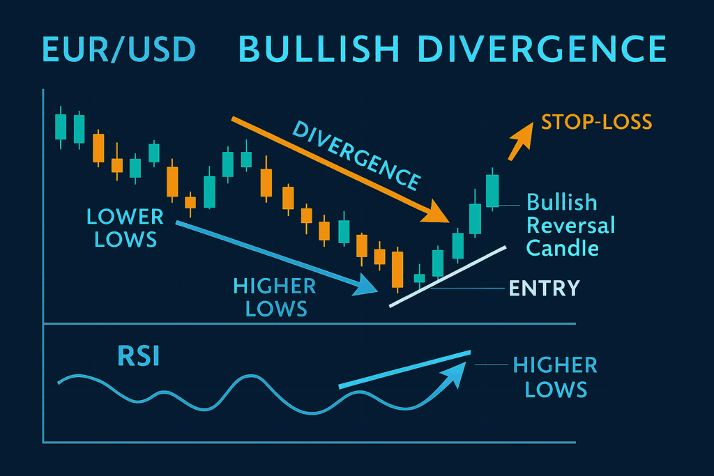 Suppose EUR/USD is making lower lows on the chart, but your RSI indicator shows higher lows. This suggests sellers are losing strength giving a potential long entry opportunity once a bullish reversal candle appears.